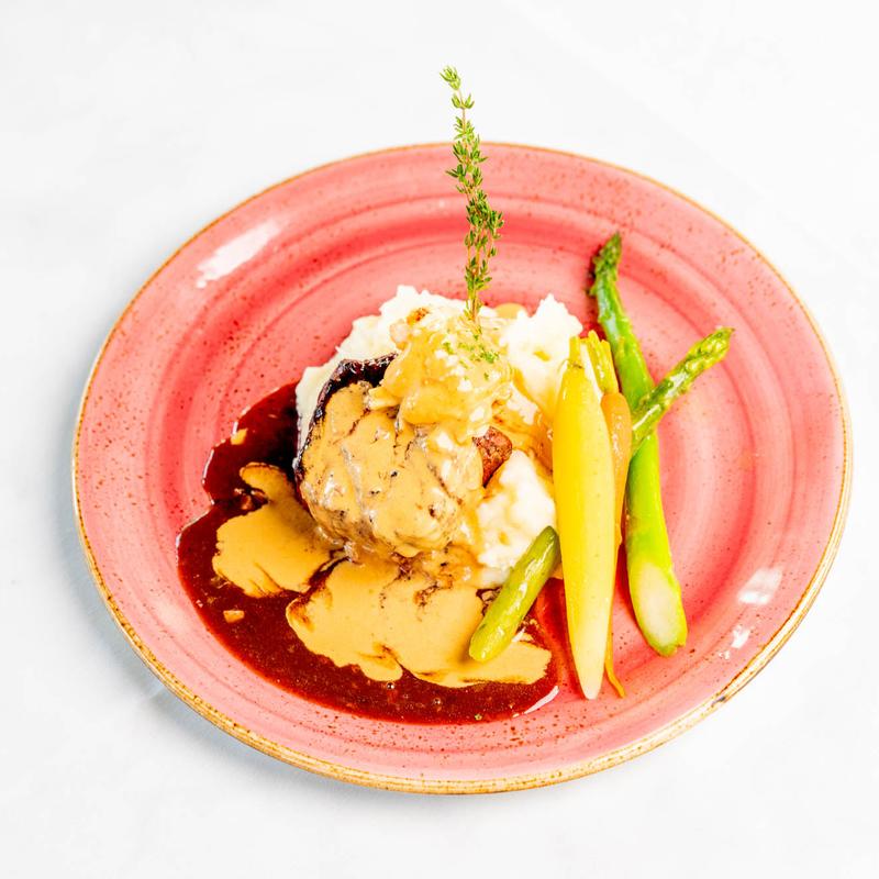 Wood-grilled 6 oz certified Black Angus beef, cabernet demi glacé. Served with mashed potatoes and vegetables.